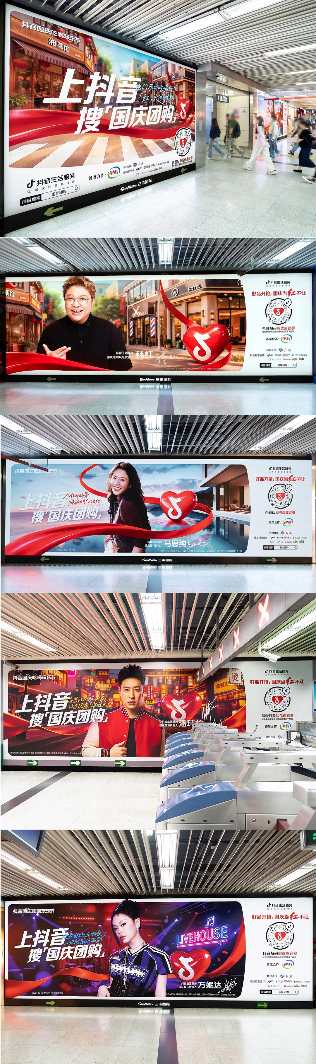 除了用沉浸式短视频“云种草”用户,活动还在线下建起强视觉冲击的“种草空间”。9月25日开始,活动用一组“红气满满”的代言人海报“承包”下北京一号线国贸地铁站,在节前向用户发起度假方式号召:韩红呼吁“尽兴吃喝玩乐”、马思纯建议“纯享躺平假日”、潘玮柏安利“吃着火锅唱着歌”,万妮达推荐“唤醒真实的我”。借助这些趣味接地气的表达,抖音生活服务不仅精准回应了大众假期的核心需求,也成功将线上互动延伸到线下做打卡转化。
