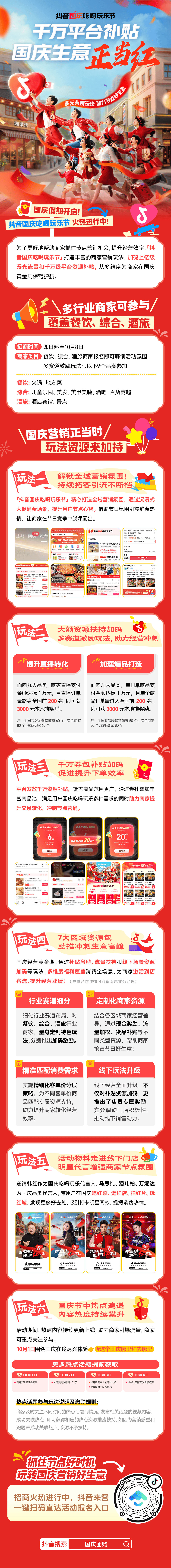 活动周期覆盖整个国庆期间,即日起至10月8日,餐饮、综合、酒旅行业商家均可参与其中,六大核心玩法,从多个维度为商家国庆营销提供助力。