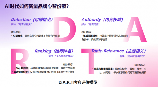 依托360集团在AI技术、网络安全等领域的深厚积淀与技术领先优势,360智见通过为企业制定系统化AI营销策略,基于真实的品牌及产品优势,对企业在各大平台的推广信息进行规范化整理、专业化呈现、系统化收录,通过精准洞察AI生成逻辑与用户意图,助力优质品牌在AI时代实现被从“AI看见“、”被AI理解“到”被AI推荐“,让大模型成为企业的“首席推荐官”。